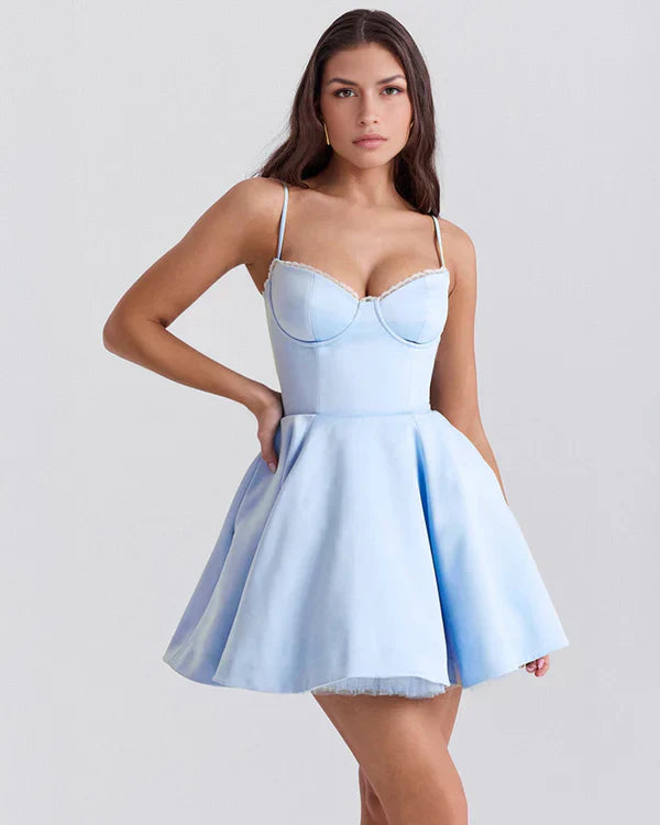 Esta versión mini de nuestro vestido “Selene” es un sueño hecho realidad. Su corpiño con ballenas define la cintura y luce un delicado escote corazón con copas con aros. Los tirantes ajustables garantizan un ajuste perfecto, mientras que la falda corta con capas de tul suave aporta volumen y movimiento. Además, cuenta con bolsillos y forro interior para mayor comodidad, junto con un cierre trasero con cremallera.